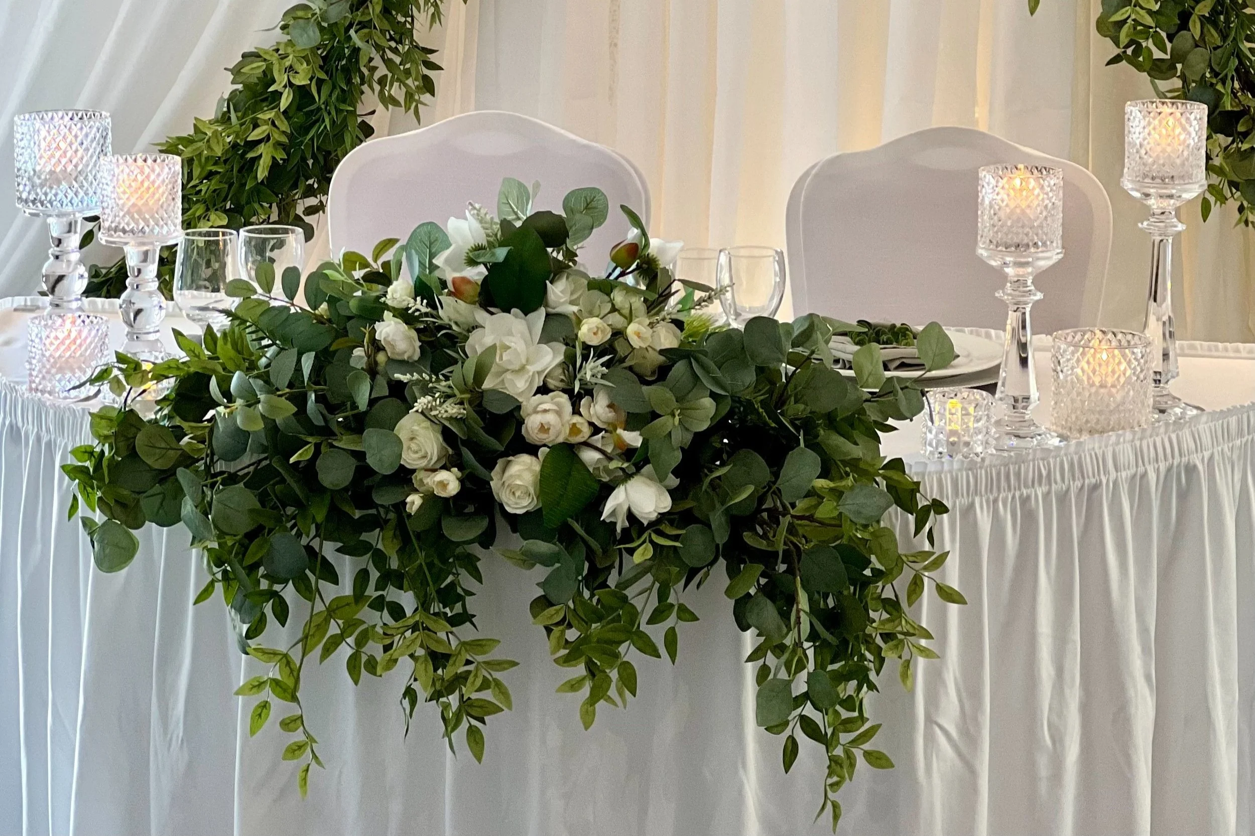 1 White floral & greenery head table arrangement